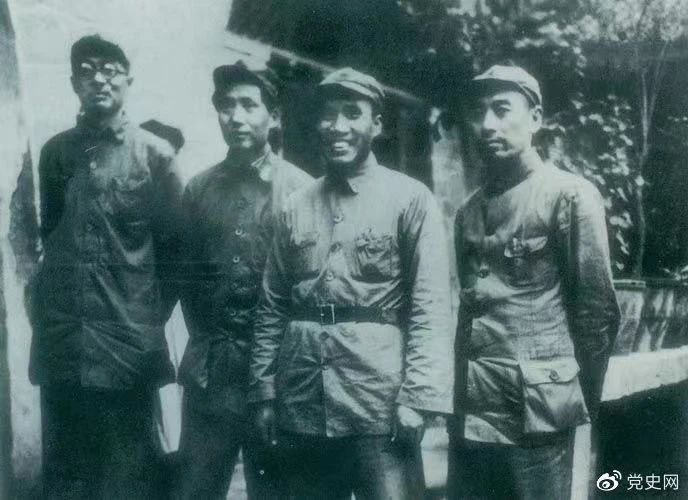 ▲1937年8月22日至25日,中共中央在陜北洛川馮家村舉行政治局?jǐn)U大會(huì)議(即洛川會(huì)議)。圖為毛澤東和朱德、周恩來(lái)、林伯渠的合影。